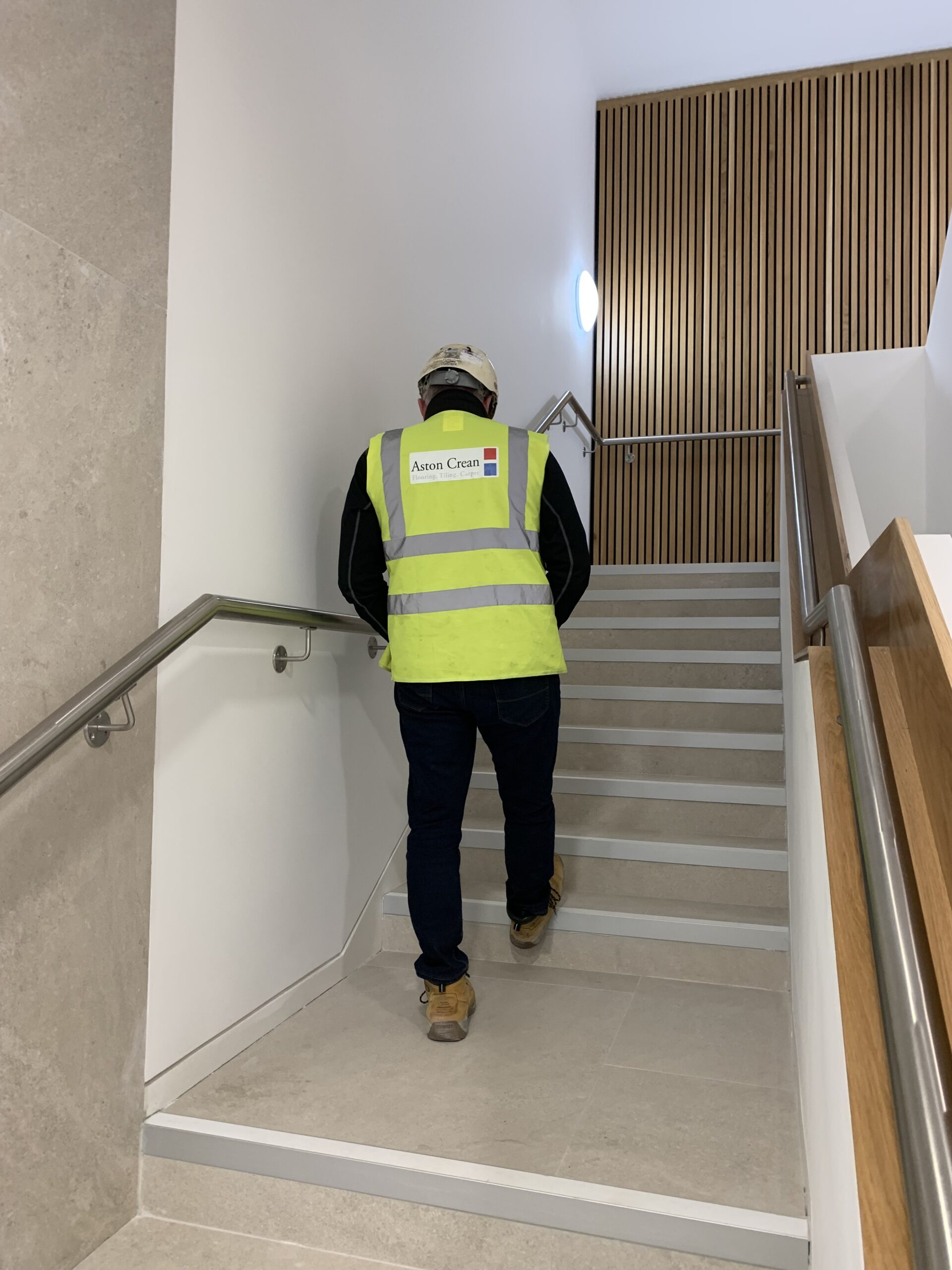 Genesis NTC 12.01 was installed to accommodate a flush finish between Porcelain tiles and the step edge with a white insert to achieve a LRV variance of 30 points.
